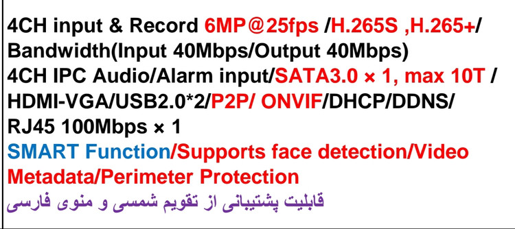 | رزولوشن ضبط | 6MP/5MP/4MP/3MP/1080P/960P/720P/D1/CIF@ 30fps/25fps(NTSC/PAL) |