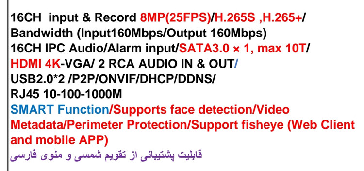 تعداد کانال : 16CH - 16CH input & Record 8MP(25FPS)/H.265S ,H.265+/