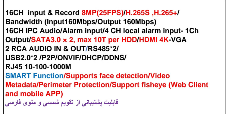| رزولوشن نمایش | 16CH(8MP(3840*2160),6MP,5MP(2592*1944) ,4MP(2592*1520),3MP(2048*1536), 2MP( 1920*1080),1280*960, 1280*720 (25fps) |