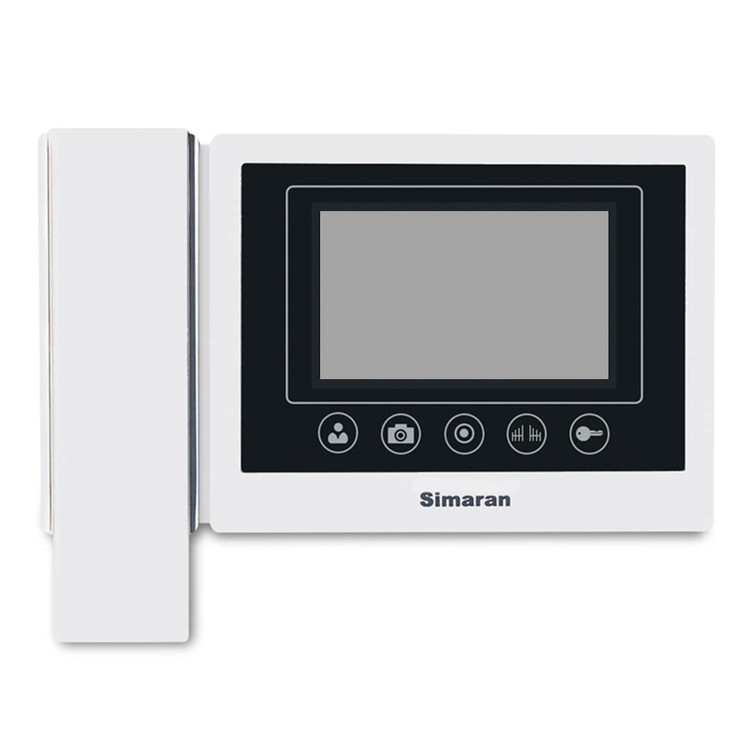مانیتور آیفون تصویری سیماران مدل 43TK با ظاهری زیبا و ساده و رنگ سفید یکی از آیفون های تصویری ایده آل می باشد و از نظر هزینه و قابلیت های موجود در این آیفون می تواند یک گزینه خوب برای کاربران باشد. صفحه نمایش این مانیتور بصورت کلید لمسی می باشد. ظاهر این مانیتور دارای بدنه ای مستطیلی شکل، ابعادی باریک با مشخصات 225*130*38 میلی متر و وزن حدود 700گرم می باشد. دمای عملکرد این آیفون بین 10- درجه تا 40 درجه سانتی گراد می باشد و همچنین ترکیب رنگ سفید و کادر مشکی دور نمایشگر موجب متمایز شدن نسبت به سایر آیفون های تصویری، جذابیت و خاص بودن این محصول می شود. آیفون تصویری مدل 43TK دارای 5 کلید لمسی می باشد که با توجه به شکل زیر از چپ به راست به شرح زیر می باشد: