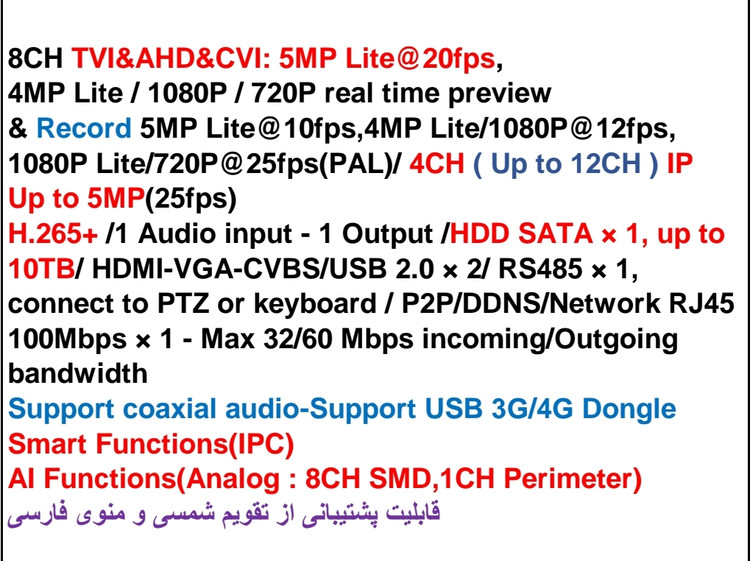 بازپخش همزمان : 8 CH(Analog & AHD/CVI/TVI)/ 1 CH IPC