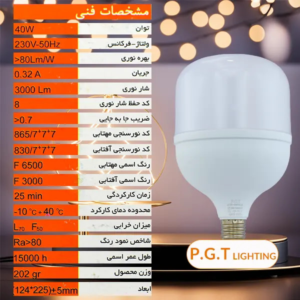 لامپ ال ای دی استوانه ای 40 وات پی جی تی PGT